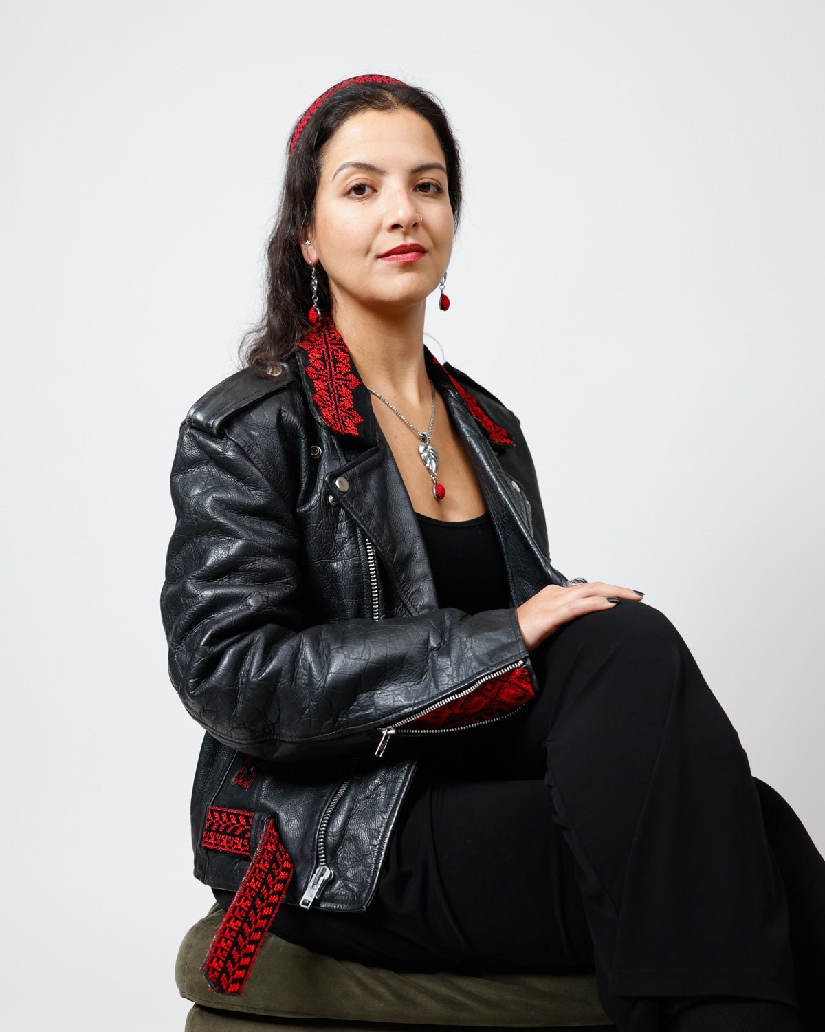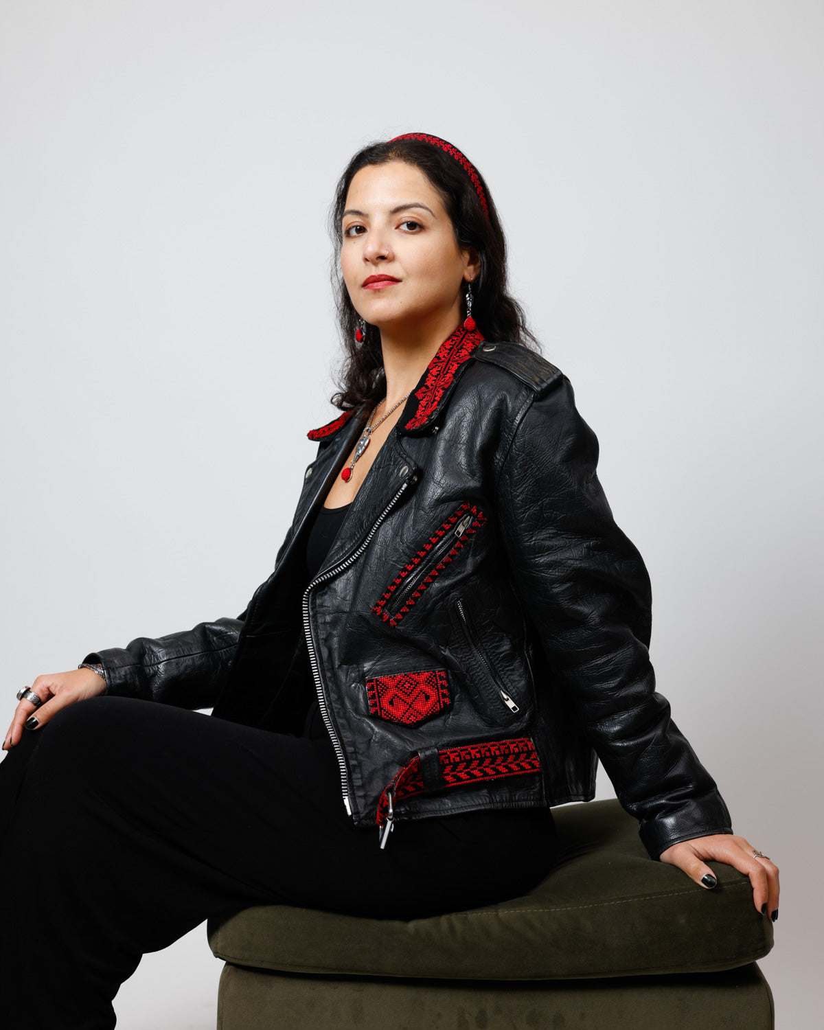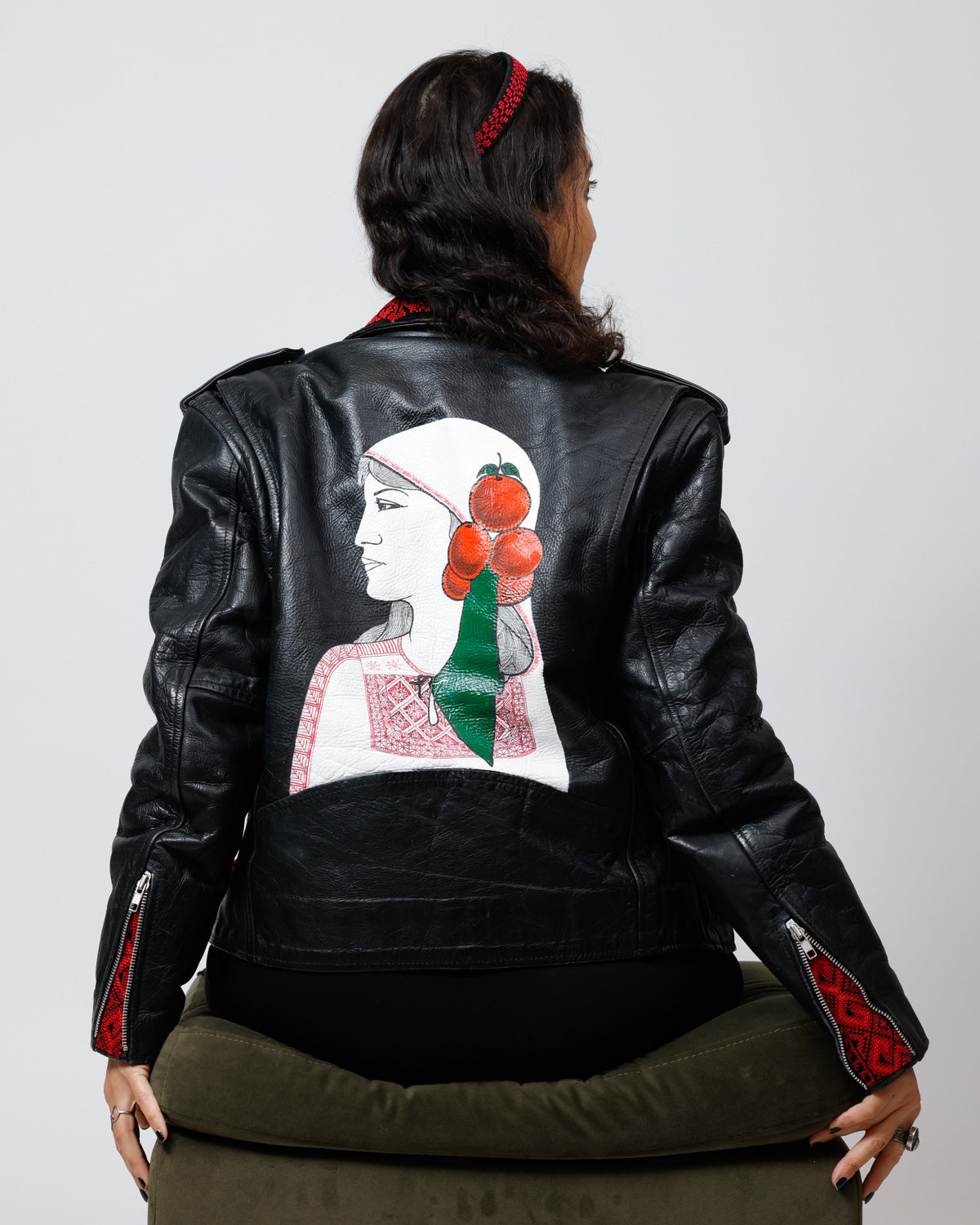 This jacket is 100% vintage leather and features applied Tatreez embroidery alongside a hand-drawn artwork on the back, paying homage to the original piece adapted in 2012 by Emad Abdel Wahhabi. The design was meticulously hand-painted and finished with a water-resistant protective coating to enhance durability and provide protection against rain.
