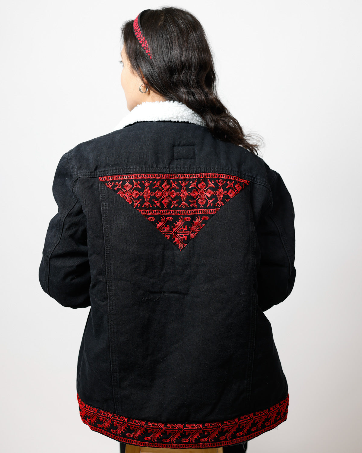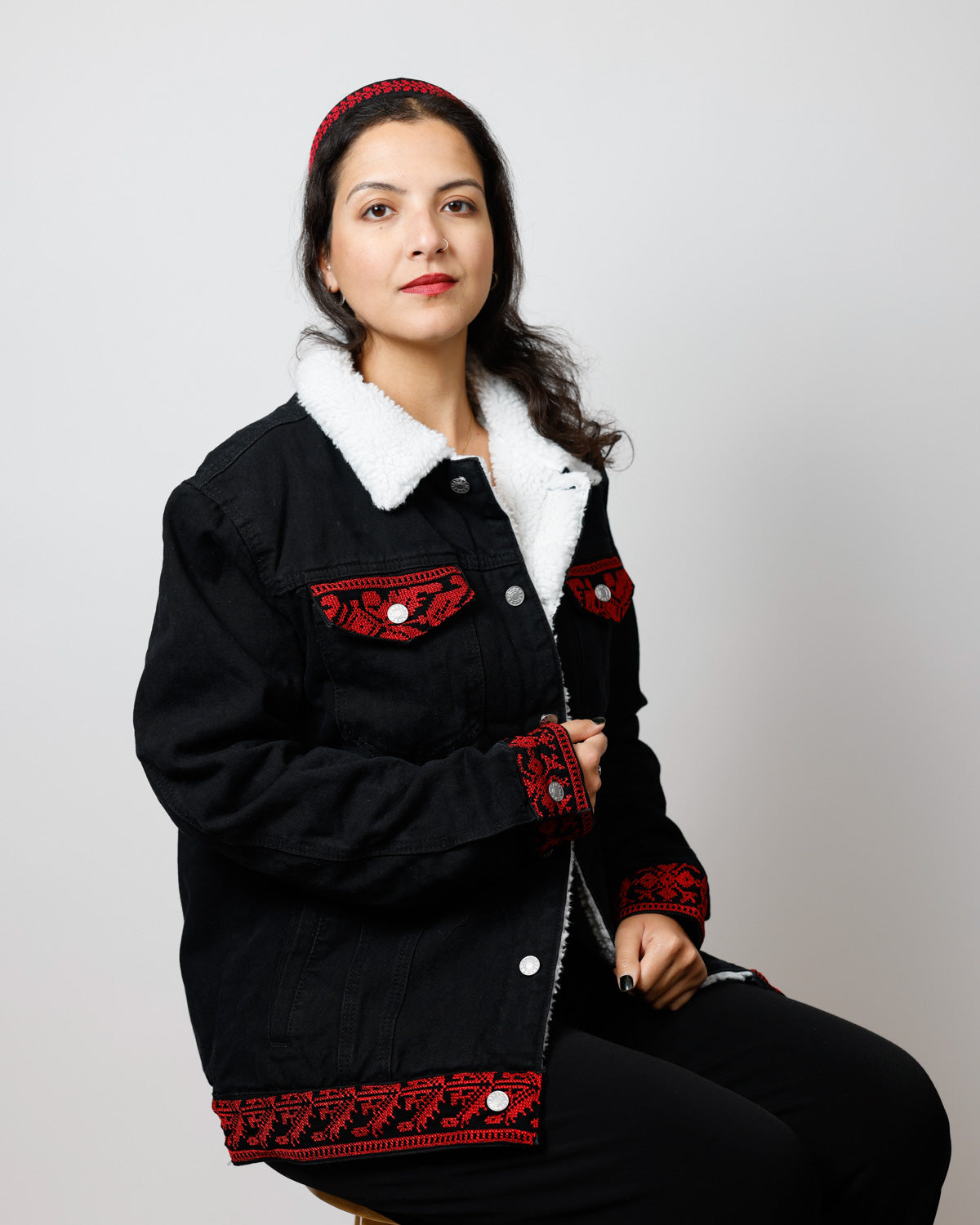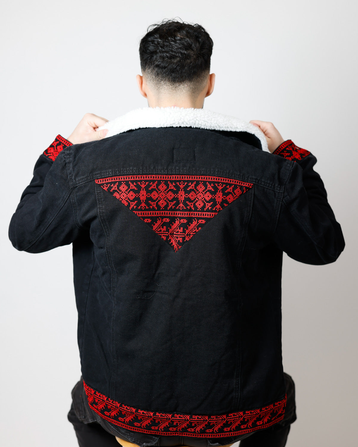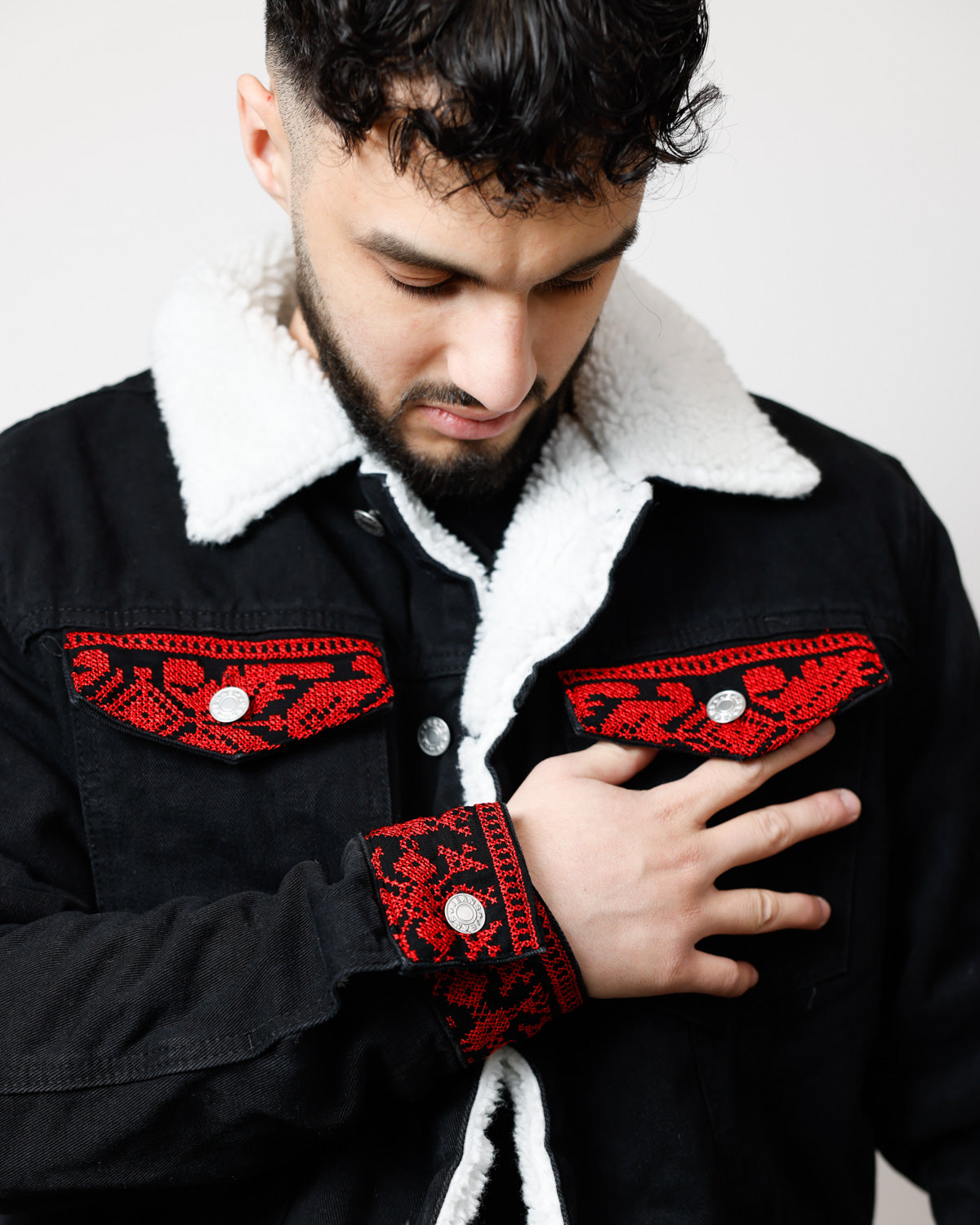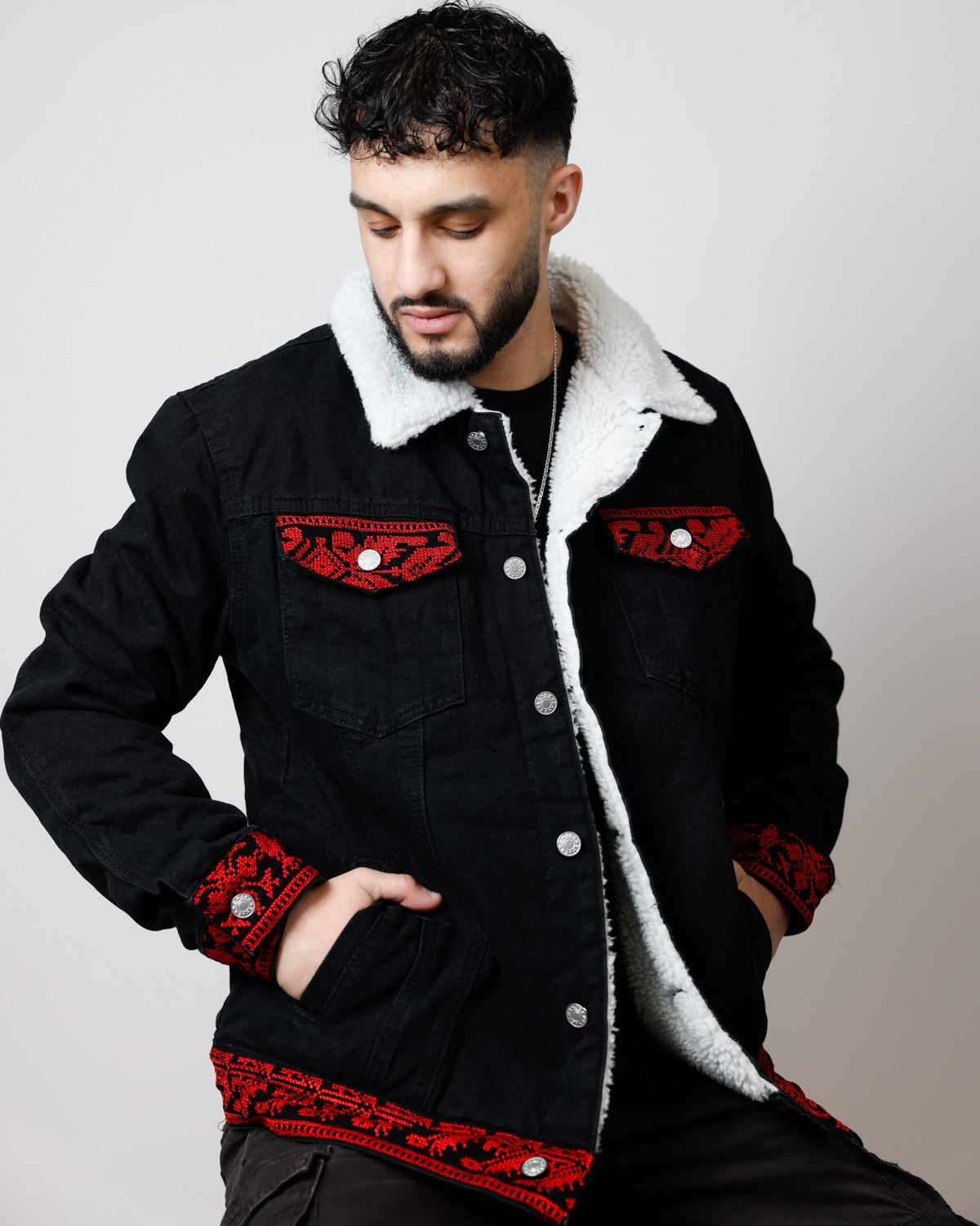 Features long sleeves with buttoned cuffs, a buttoned hem, and a turn-down collar on this versatile Tatreez jacket. Functional pockets include two chest flap pockets with button closure and two side pockets, perfect for this sherpa lined denim jacket men and mens jean jacket with fur